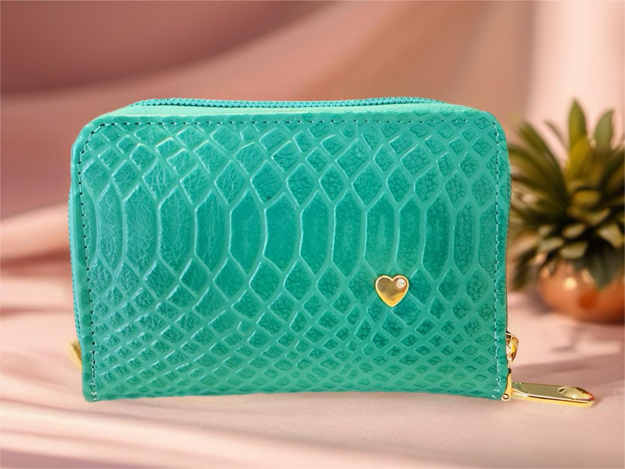 Monedero compacto de cuero genuino en tono turquesa, con textura tipo reptil, cierre de cremallera y herrajes dorados. Lleva un detalle de corazón dorado al frente.
